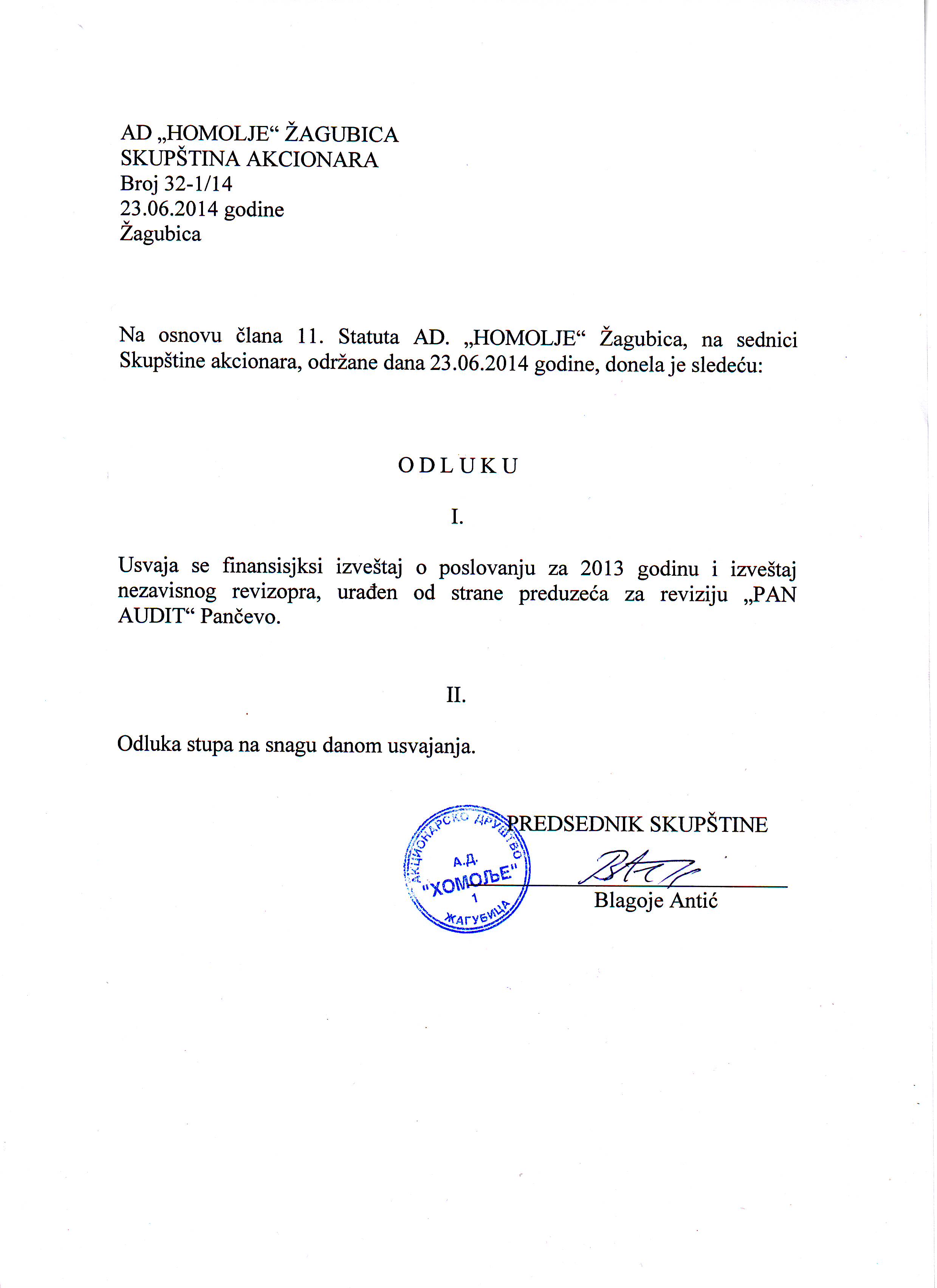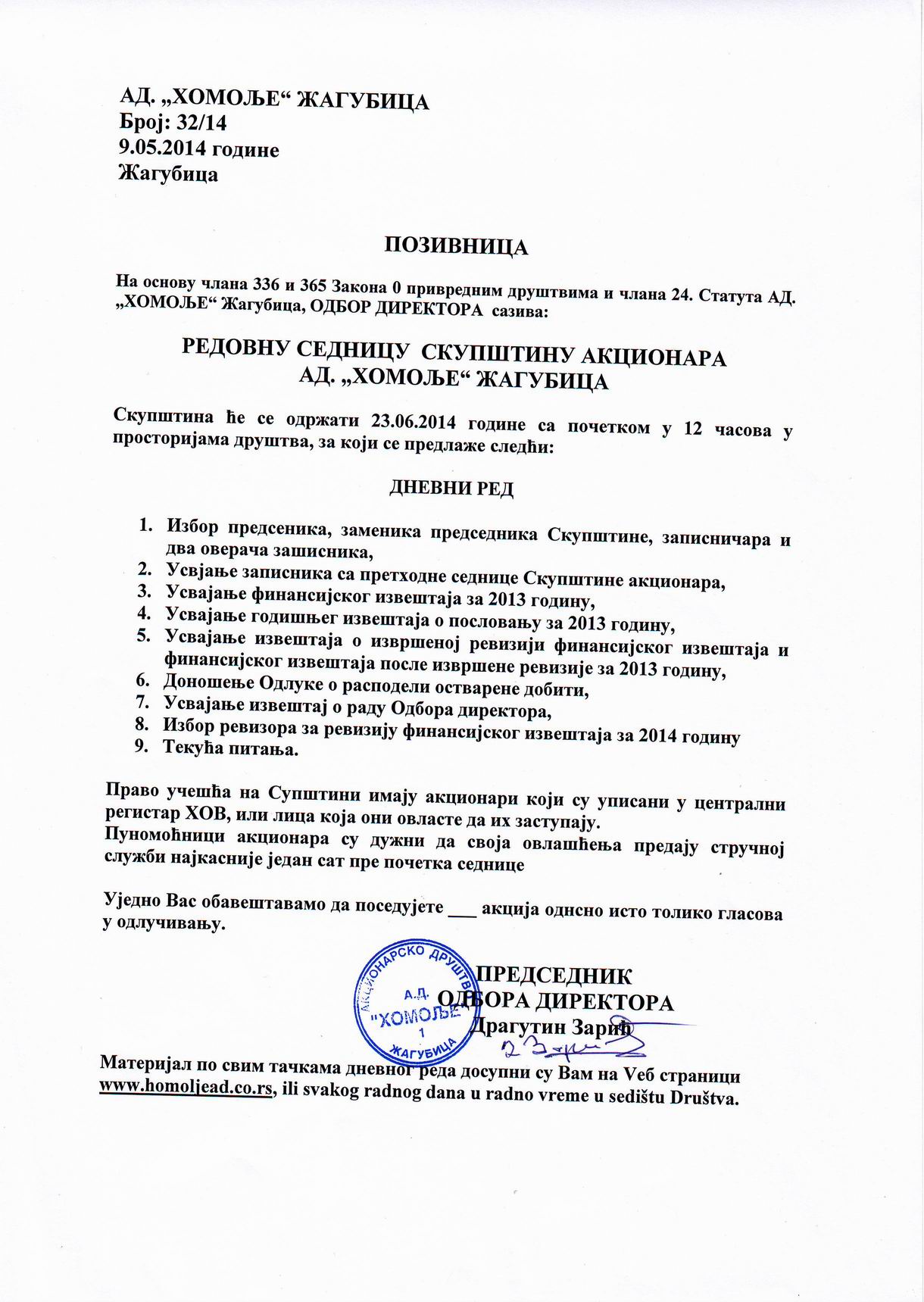 Redovna sednica Skupštine akcionara održana je 23.06.2014. godine sa početkom u 12:00 časova u prostorijama "Homolje AD".